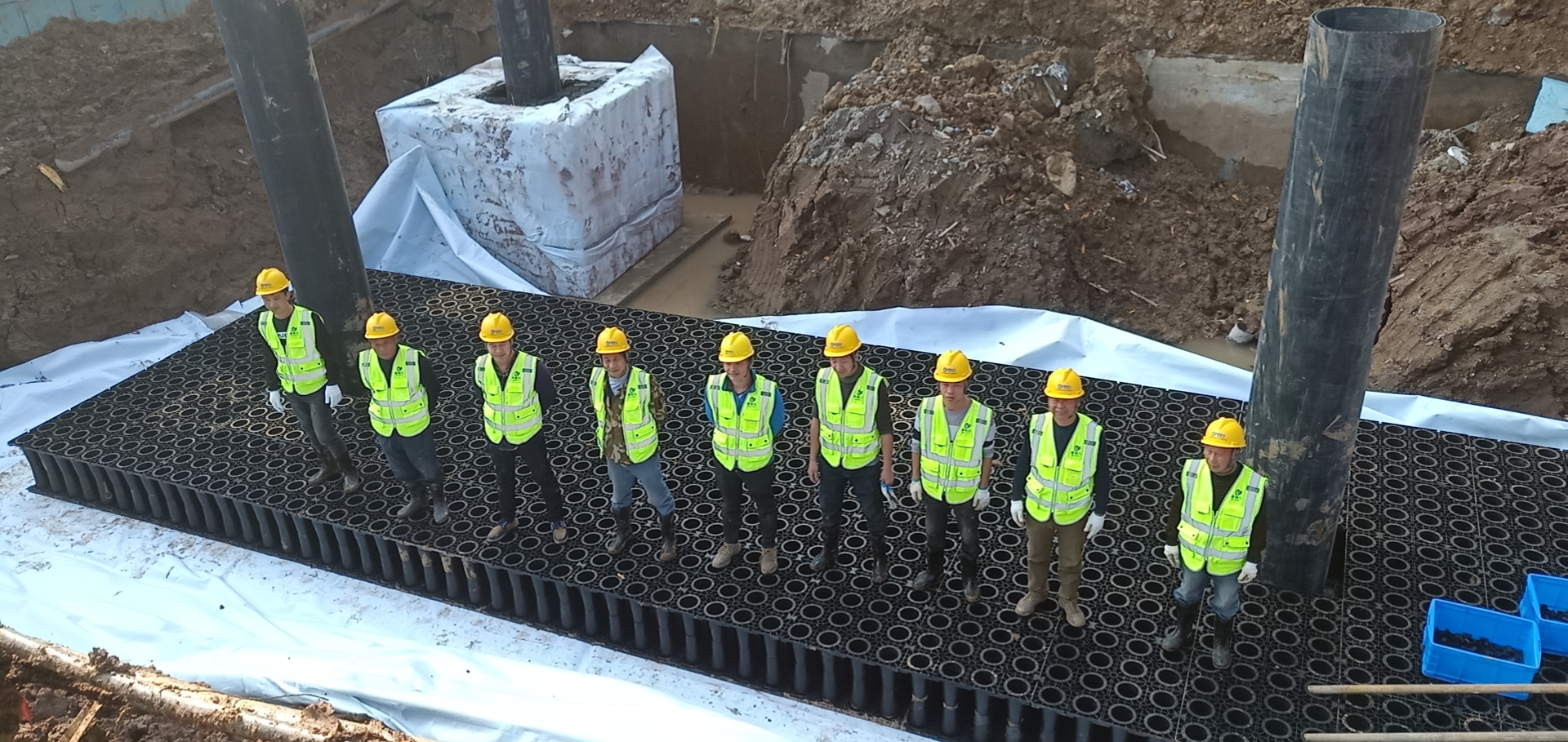 該項目雨水收集系統采用地埋PP模塊組合水池的方式收集雨水,前期經過截污掛籃、棄流過濾,后期通過地埋一體機過濾,消毒,最終使水質達到規范標準,用于廠區綠地的澆灑,景觀補水,道路沖洗等。